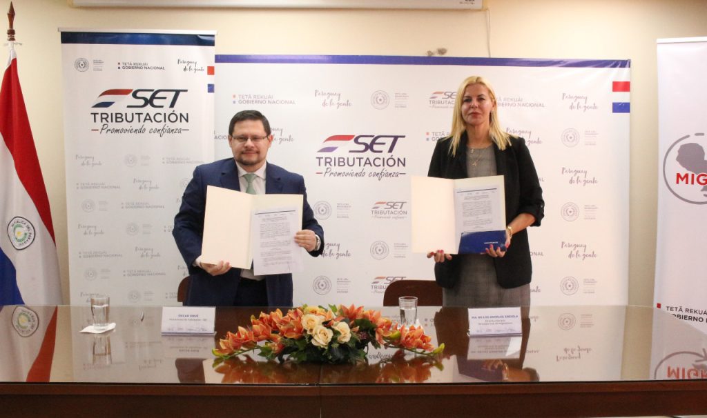 El acto se llevó a cabo en la mañana de este lunes, en sede de la Subsecretaría de Estado de Tributación del Ministerio de Hacienda, convenio rubricado por la directora general de Migraciones, María de los Ángeles Arriola, y el viceministro de Tributación, Óscar Alcides Orué Ortíz.