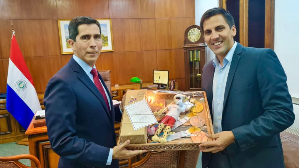 Durante la visita de cortesía, el titular de Deportes hizo entrega de un obsequio al Ministro González, que consistió en réplicas de medallas y de la mascota oficial del ODESUR, “Tirika”.