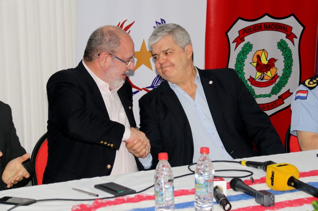 El Ministro del Interior Enrique Riera en compañía del Comandante de la Policía Nacional, Crio. Gral. Cmdte. Carlos Humberto Benítez y el Director Gral. de la Itaipú Binacional, Justo Zacarías, participó de la firma de convenio entre la Policía Nacional y la Fundación TESAI de la Entidad Binacional, que prestará sus servicios de salud a los efectivos de la Policía Nacional.